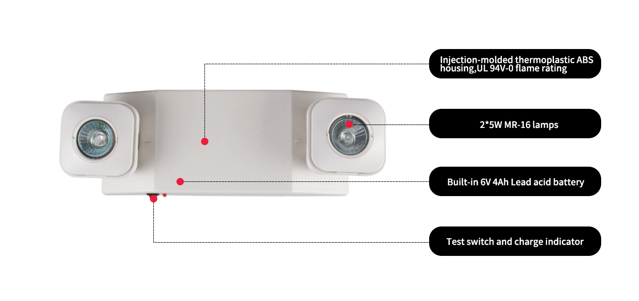 Hjem / Produkt / Nødlys / Dobbelt hovednødlys / JEU2 2X5W MR-16 nødlampe