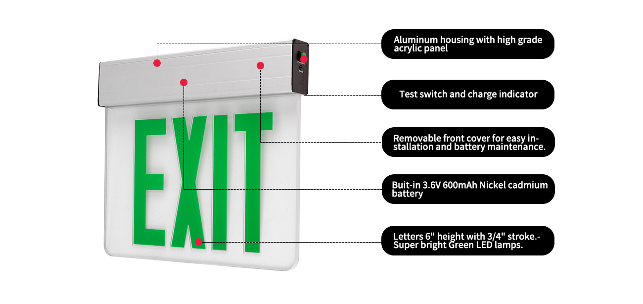 Det ultimative exit -tegn i design og alsidighed. Dette grønne LED Edge Lit Exit -tegn vil løse næsten ethvert monteringskonfigurationsproblem.  Denne ene stil giver mulighed for installation af loft, side og vægmontering.  Kanten Lit -panelet er konstrueret af akryl af høj kvalitet med tilpassede retningsbestemte pile, der skal peger mod udgangsretning. Den aftagelige frontdæksel gør installation og vedligeholdelseshovedpinefri!