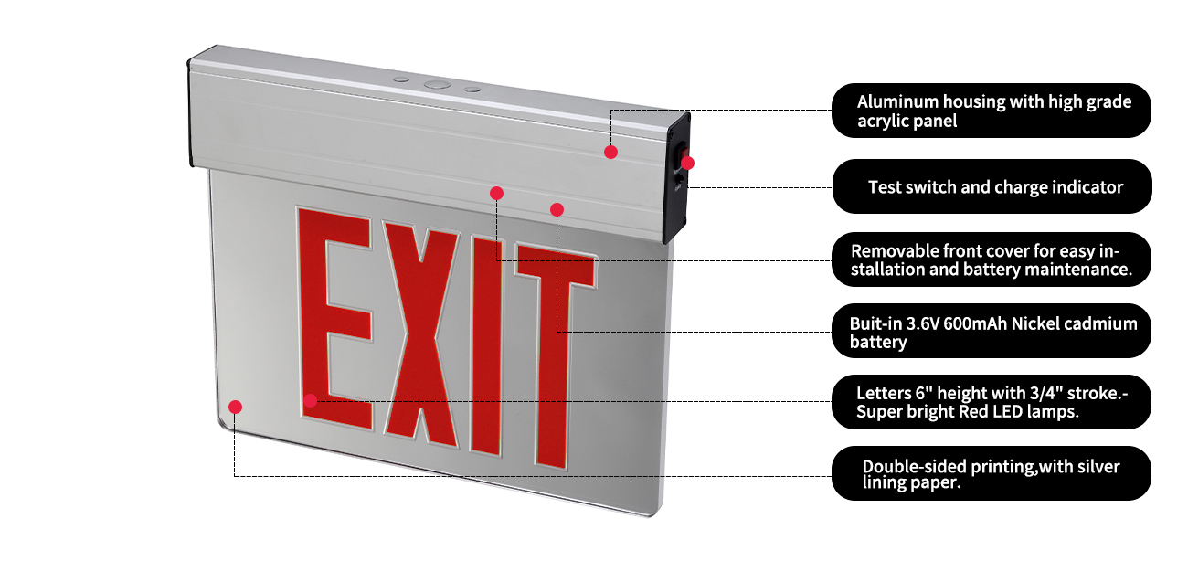 Det ultimative exit -tegn i design og alsidighed. Dette røde LED -kantbeløbte udgangsskilt vil løse næsten ethvert monteringskonfigurationsproblem.  Denne ene stil giver mulighed for installation af loft, side og vægmontering.  Edge Lit-panelet er konstrueret af akryl af høj kvalitet med tilpassede retningsbestemte pile, der skal peger mod udgangsretning. Mirror divider-single og på dobbelt ansigtsversioner. Den aftagelige frontdæksel gør installation og vedligeholdelseshovedpinefri!