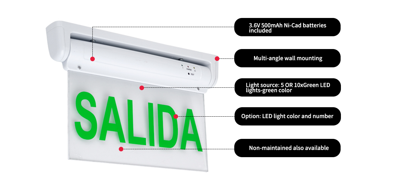 *Konstruktion - LED -udgangsskiltet er konstrueret af die -cast ABS -hus med et klart akrylpanel. Hvide boliger er standard.